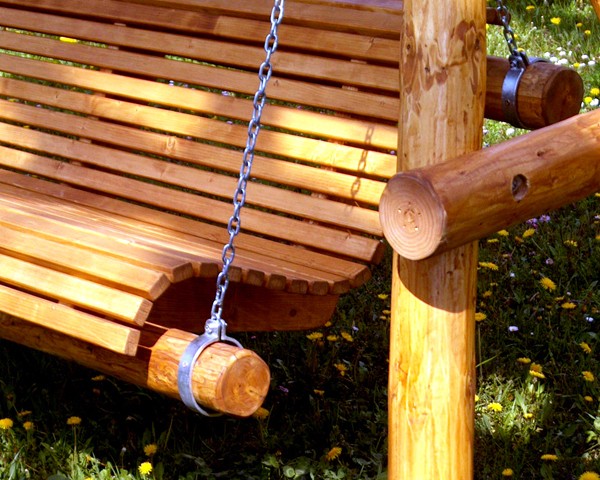 Structura din truchiuri întregi e acoperita cu scânduri impregnate. Banca-leagan suspendata pe lant galvanizat si articulata cu rulmenti ofera confort maxim datorita configuratiei ergonomice.